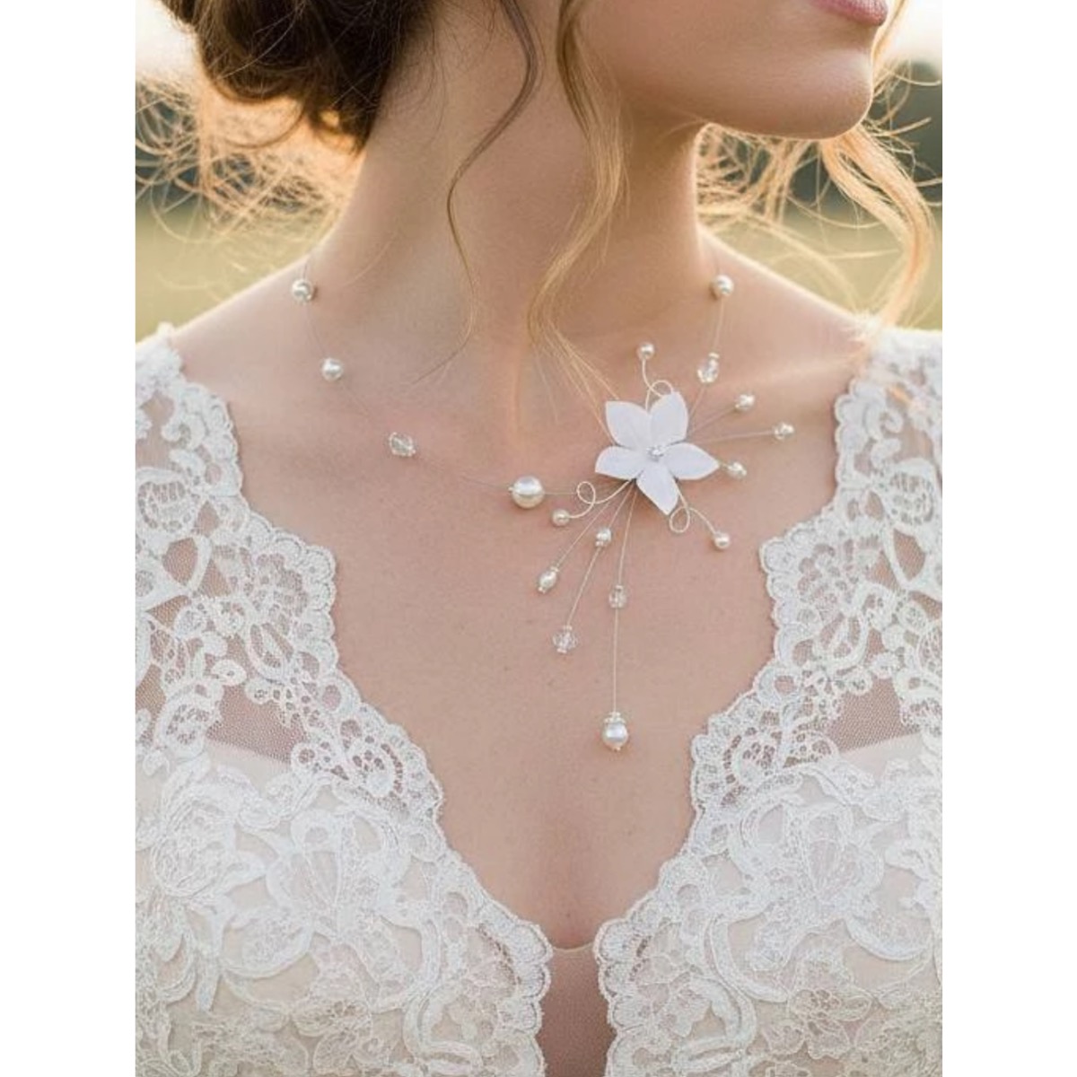 Ce collier n’est ni trop fin ni trop imposant : il se voit juste ce qu’il faut. Les fleurs délicates et les perles lumineuses qui le composent apportent éclat et élégance à votre décolleté, tout en restant harmonieux avec votre robe de mariée.