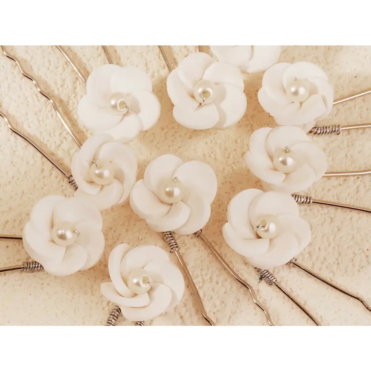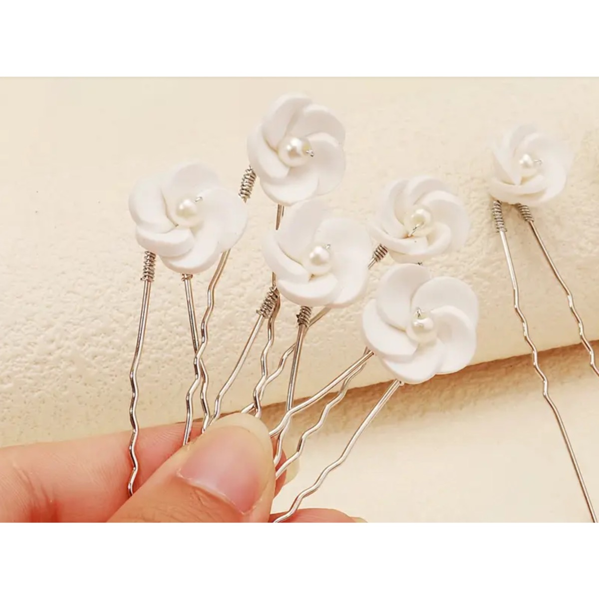 Ces épingles pour chignon de mariage sont composées de fleurs blanches en argile polymère délicatement façonnées, chacune rehaussée d’une petite perle nacrée au cœur. Leur finition élégante et leur forme légère leur permettent de s’intégrer facilement dans la chevelure, que celle-ci soit fine ou épaisse.